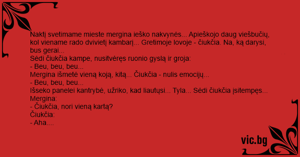 Naktį svetimame mieste mergina ieško nakvynės... Apieškojo daug viešbučių, kol viename rado dvivietį kambarį... Gretimoje lovoje - čiukčia. Na, ką darysi, bus gerai...