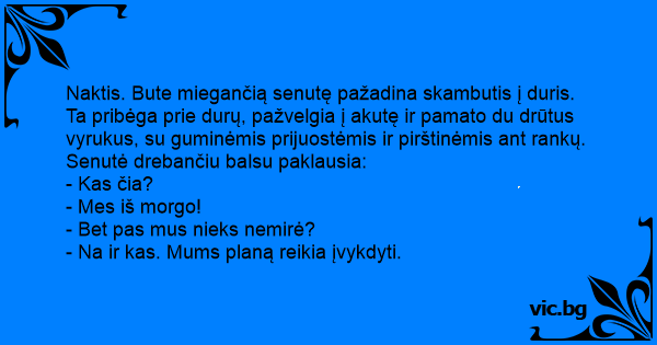Naktis. Bute miegančią senutę pažadina skambutis į duris. Ta pribėga prie durų, pažvelgia į akutę ir pamato du drūtus vyrukus, su guminėmis prijuostėmis ir pirštinėmis ant rankų. Senutė drebančiu balsu paklausia: