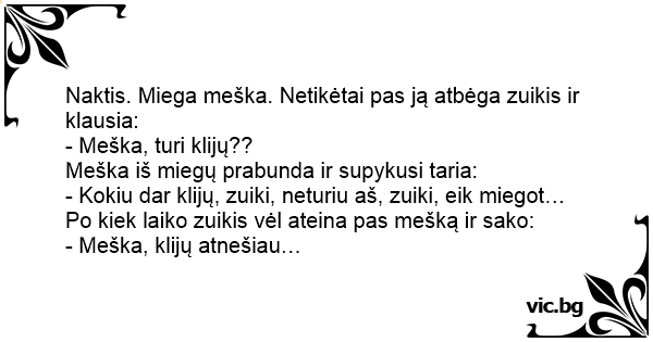 Naktis. Miega meška. Netikėtai pas ją atbėga zuikis ir klausia: