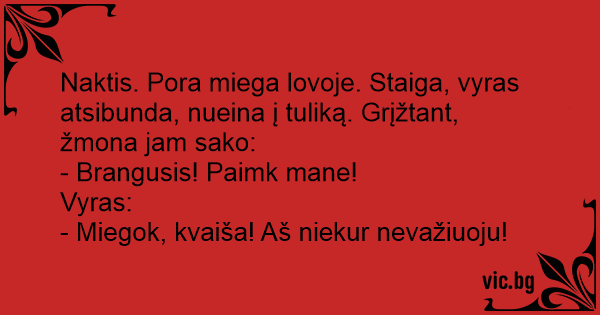 Naktis. Pora miega lovoje. Staiga, vyras atsibunda, nueina į tuliką. Grįžtant, žmona jam sako: