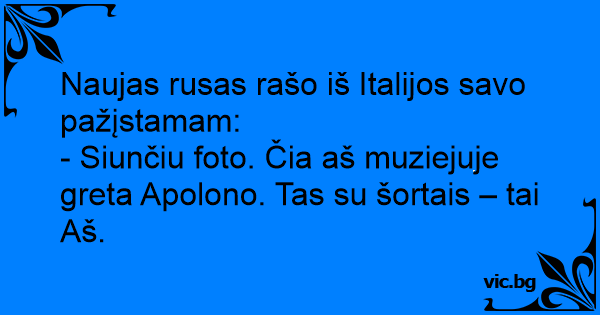 - Siunčiu foto. Čia aš muziejuje greta Apolono. Tas su šortais – tai Aš.