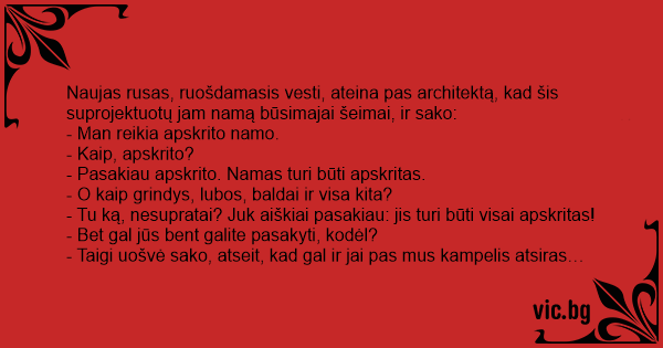 Naujas rusas, ruošdamasis vesti, ateina pas architektą, kad šis suprojektuotų jam namą būsimajai šeimai, ir sako: