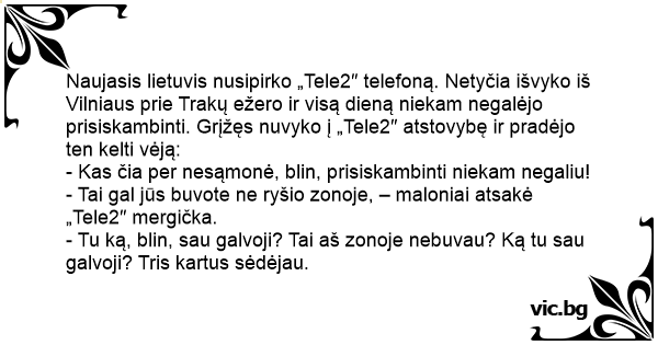 Naujasis lietuvis nusipirko „Tele2″ telefoną. Netyčia išvyko iš Vilniaus prie Trakų ežero ir visą dieną niekam negalėjo prisiskambinti. Grįžęs nuvyko į „Tele2″ atstovybę ir pradėjo ten kelti vėją: