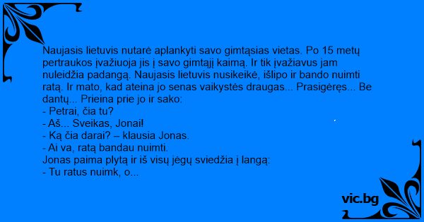 Naujasis lietuvis nutarė aplankyti savo gimtąsias vietas. Po 15 metų pertraukos įvažiuoja jis į savo gimtąjį kaimą. Ir tik įvažiavus jam nuleidžia padangą. Naujasis lietuvis nusikeikė, išlipo ir bando nuimti ratą. Ir mato, kad ateina jo senas vaikystės draugas... Prasigėręs... Be dantų... Prieina prie jo ir sako: