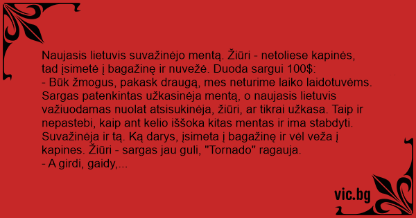 Sargas patenkintas užkasinėja mentą, o naujasis lietuvis važiuodamas nuolat atsisukinėja, žiūri, ar tikrai užkasa. Taip ir nepastebi, kaip ant kelio iššoka kitas mentas ir ima stabdyti. Suvažinėja ir tą. Ką darys, įsimeta į bagažinę ir vėl veža į kapines. Žiūri - sargas jau guli, "Tornado" ragauja.