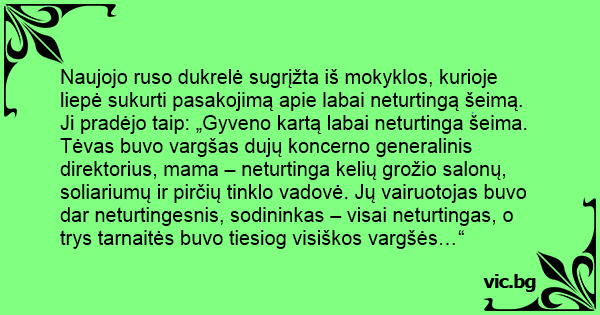 Naujojo ruso dukrelė sugrįžta iš mokyklos, kurioje liepė sukurti pasakojimą apie labai neturtingą šeimą. Ji pradėjo taip: „Gyveno kartą labai neturtinga šeima. Tėvas buvo vargšas dujų koncerno generalinis direktorius, mama – neturtinga kelių grožio salonų, soliariumų ir pirčių tinklo vadovė. Jų vairuotojas buvo dar neturtingesnis, sodininkas – visai neturtingas, o trys tarnaitės buvo tiesiog visiškos vargšės…“