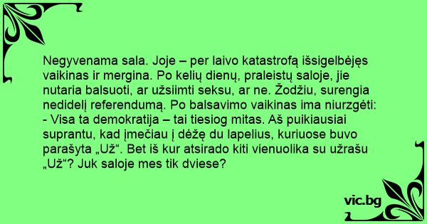 Negyvenama sala. Joje – per laivo katastrofą išsigelbėjęs vaikinas ir mergina. Po kelių dienų, praleistų saloje, jie nutaria balsuoti, ar užsiimti seksu, ar ne. Žodžiu, surengia nedidelį referendumą. Po balsavimo vaikinas ima niurzgėti: