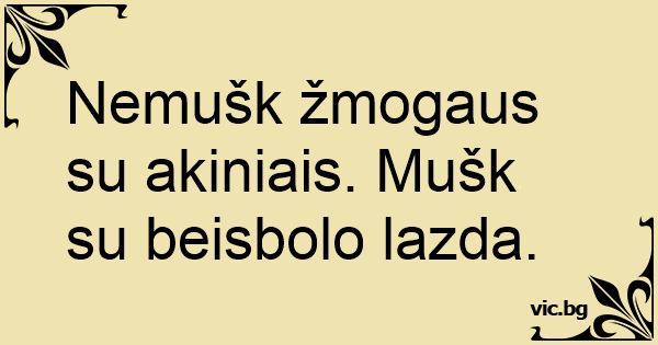 Nemušk žmogaus su akiniais. Mušk su beisbolo lazda.