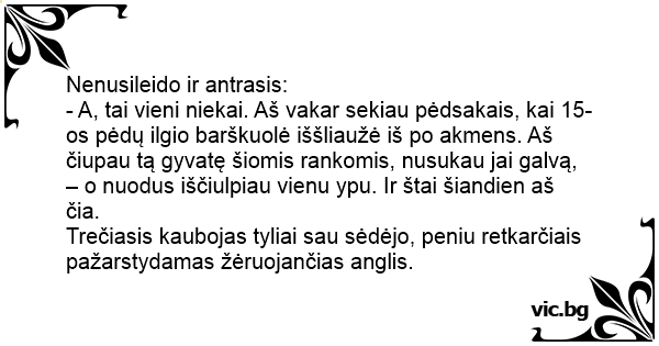 - A, tai vieni niekai. Aš vakar sekiau pėdsakais, kai 15-os pėdų ilgio barškuolė iššliaužė iš po akmens. Aš čiupau tą gyvatę šiomis rankomis, nusukau jai galvą, – o nuodus iščiulpiau vienu ypu. Ir štai šiandien aš čia.