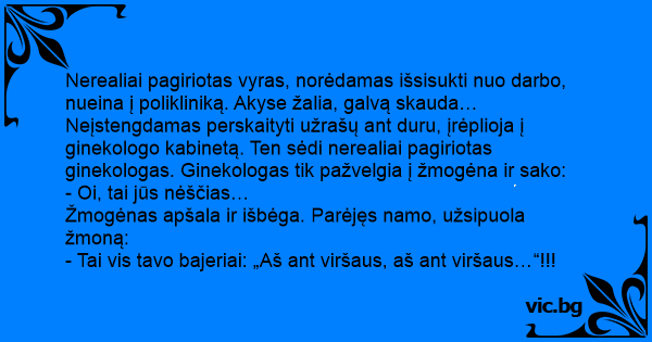 Nerealiai pagiriotas vyras, norėdamas išsisukti nuo darbo, nueina į polikliniką. Akyse žalia, galvą skauda… Neįstengdamas perskaityti užrašų ant duru, įrėplioja į ginekologo kabinetą. Ten sėdi nerealiai pagiriotas ginekologas. Ginekologas tik pažvelgia į žmogėna ir sako: