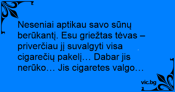Neseniai aptikau savo sūnų berūkantį. Esu griežtas tėvas – priverčiau jį suvalgyti visa cigarečių pakelį… Dabar jis nerūko… Jis cigaretes valgo…