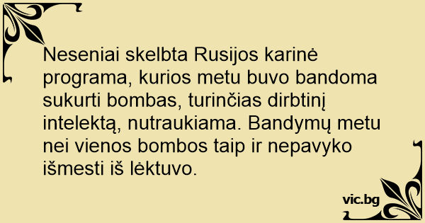 Neseniai skelbta Rusijos karinė programa, kurios metu buvo bandoma sukurti bombas, turinčias dirbtinį intelektą, nutraukiama. Bandymų metu nei vienos bombos taip ir nepavyko išmesti iš lėktuvo.