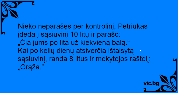 Nieko neparašęs per kontrolinį, Petriukas įdeda į sąsiuvinį 10 litų ir parašo: