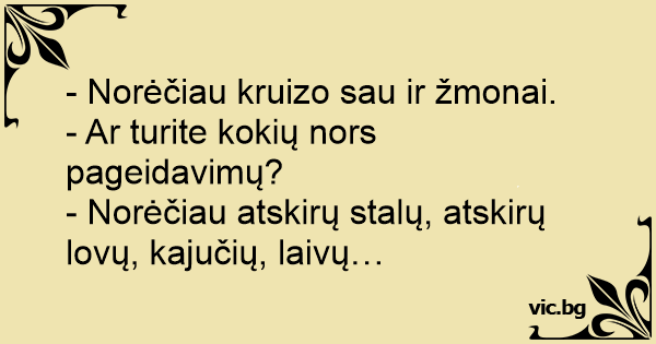 - Norėčiau atskirų stalų, atskirų lovų, kajučių, laivų…