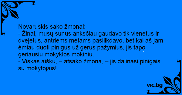 - Žinai, mūsų sūnus anksčiau gaudavo tik vienetus ir dvejetus, antriems metams pasilikdavo, bet kai aš jam ėmiau duoti pinigus už gerus pažymius, jis tapo geriausiu mokyklos mokiniu.