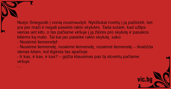 - Nusiėmė liemenelę, nusiėmė liemenelę, nusiėmė liemenelę – šnabžda vienas kitam, kol išgirsta tas apačioje.