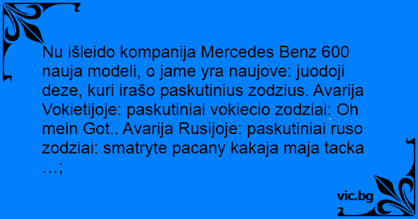 Nu išleido kompanija Mercedes Benz 600 nauja modeli, o jame yra naujove: juodoji deze, kuri irašo paskutinius zodzius. Avarija Vokietijoje: paskutiniai vokiecio zodziai: Oh mein Got.. Avarija Rusijoje: paskutiniai ruso zodziai: smatryte pacany kakaja maja tacka …;