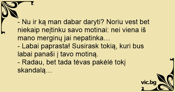 - Nu ir ką man dabar daryti? Noriu vest bet niekaip neįtinku savo motinai: nei viena iš mano merginų jai nepatinka…