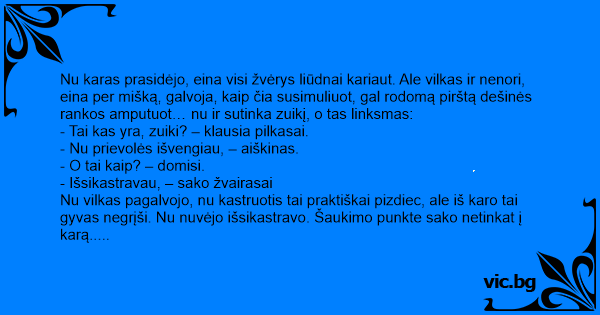 Nu karas prasidėjo, eina visi žvėrys liūdnai kariaut. Ale vilkas ir nenori, eina per mišką, galvoja, kaip čia susimuliuot, gal rodomą pirštą dešinės rankos amputuot… nu ir sutinka zuikį, o tas linksmas: