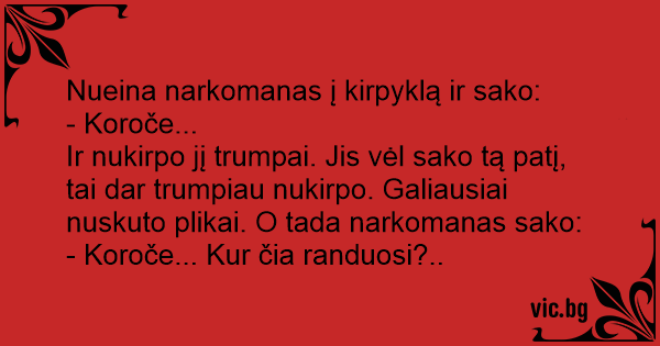 Ir nukirpo jį trumpai. Jis vėl sako tą patį, tai dar trumpiau nukirpo. Galiausiai nuskuto plikai. O tada narkomanas sako: