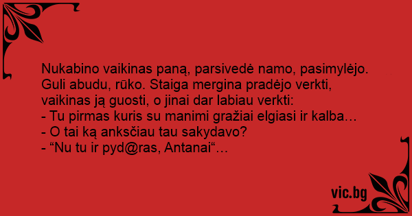 Nukabino vaikinas paną, parsivedė namo, pasimylėjo. Guli abudu, rūko. Staiga mergina pradėjo verkti, vaikinas ją guosti, o jinai dar labiau verkti:
