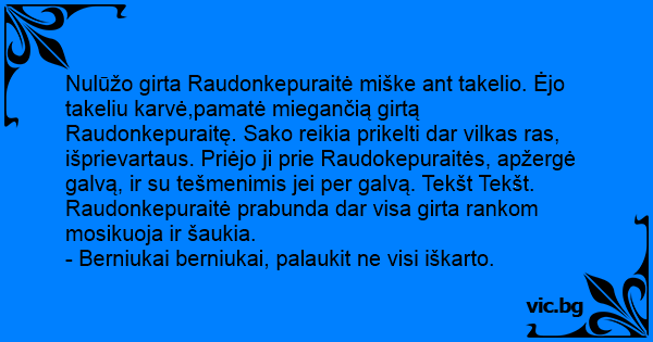 Nulūžo girta Raudonkepuraitė miške ant takelio. Ėjo takeliu karvė,pamatė miegančią girtą Raudonkepuraitę. Sako reikia prikelti dar vilkas ras, išprievartaus. Priėjo ji prie Raudokepuraitės, apžergė galvą, ir su tešmenimis jei per galvą. Tekšt Tekšt. Raudonkepuraitė prabunda dar visa girta rankom mosikuoja ir šaukia.