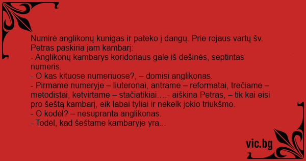 - Pirmame numeryje – liuteronai, antrame – reformatai, trečiame – metodistai, ketvirtame – stačiatikiai…,- aiškina Petras, – tik kai eisi pro šeštą kambarį, eik labai tyliai ir nekelk jokio triukšmo.