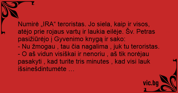 Numirė „IRA“ teroristas. Jo siela, kaip ir visos, atėjo prie rojaus vartų ir laukia eilėje. Šv. Petras pasižiūrėjo į Gyvenimo knygą ir sako: