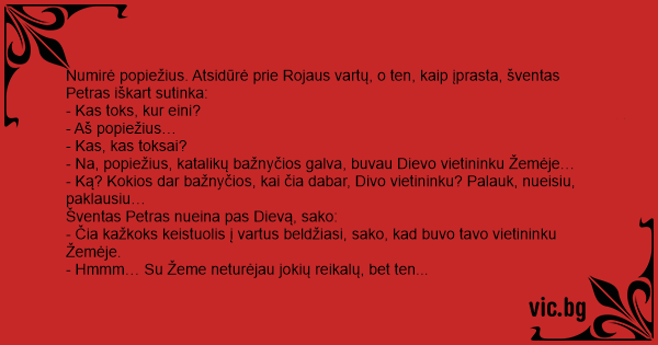 Numirė popiežius. Atsidūrė prie Rojaus vartų, o ten, kaip įprasta, šventas Petras iškart sutinka: