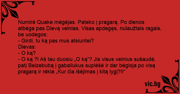 Numirė Quake mėgėjas. Pateko į pragarą. Po dienos atbėga pas Dievą velnias. Visas apdegęs, nulaužtais ragais, be uodegos: