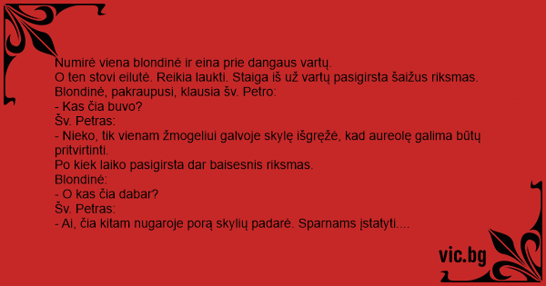 Блондинка стои пред входа на Рая, а Свети Петър и преглежда документите, да види дали е за там. Докато прелиства, се чува ужасяващ вик отвън... Блондинката притеснено пита: