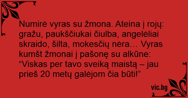 Numirė vyras su žmona. Ateina į rojų: gražu, paukščiukai čiulba, angelėliai skraido, šilta, mokesčių nėra… Vyras kumšt žmonai į pašonę su alkūne: