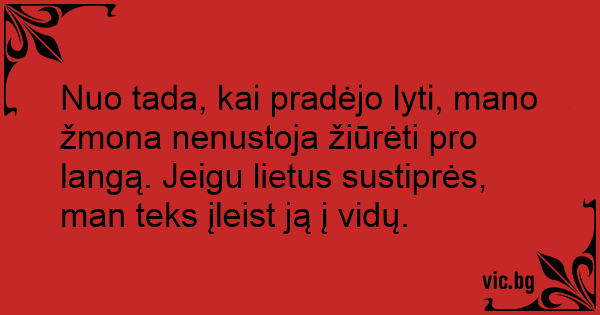 Nuo tada, kai pradėjo lyti, mano žmona nenustoja žiūrėti pro langą. Jeigu lietus sustiprės, man teks įleist ją į vidų.