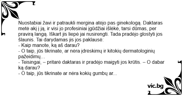 - Irgi teisingai, – pritarė daktaras ir, neištvėręs, pradėjo lytiškai su ja bendrauti. – O dabar ką darau?