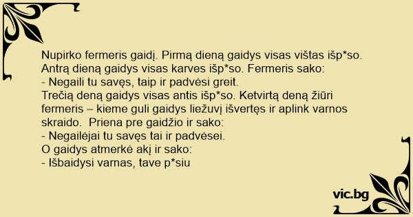 Nupirko fermeris gaidį. Pirmą dieną gaidys visas vištas išp*so. Antrą dieną gaidys visas karves išp*so. Fermeris sako: