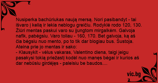 - Klausykit - vėlus vakaras, Valentino diena, taigi jeigu pasakysi tokią priežastį kodėl nuo manęs bėgai ir kurios aš dar nebūsiu girdėjęs - paleisiu be baudos.