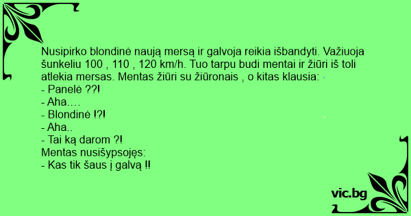 Nusipirko blondinė naują mersą ir galvoja reikia išbandyti. Važiuoja šunkeliu 100 , 110 , 120 km/h. Tuo tarpu budi mentai ir žiūri iš toli atlekia mersas. Mentas žiūri su žiūronais , o kitas klausia: