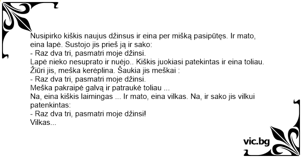Nusipirko kiškis naujus džinsus ir eina per mišką pasipūtęs. Ir mato, eina lapė. Sustojo jis prieš ją ir sako: