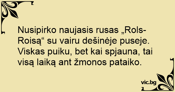 Nusipirko naujasis rusas „Rols-Roisą“ su vairu dešinėje puseje. Viskas puiku, bet kai spjauna, tai visą laiką ant žmonos pataiko.