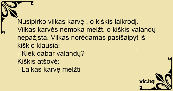 Nusipirko vilkas karvę , o kiškis laikrodį. Vilkas karvės nemoka melžt, o kiškis valandų nepažįsta. Vilkas norėdamas pasišaipyt iš kiškio klausia: