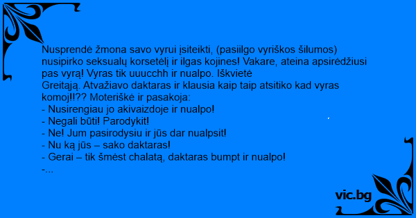 Nusprendė žmona savo vyrui įsiteikti, (pasiilgo vyriškos šilumos) nusipirko seksualų korsetėlį ir ilgas kojines! Vakare, ateina apsirėdžiusi pas vyrą! Vyras tik uuucchh ir nualpo. Iškvietė
