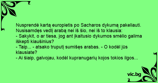 Nusprendė kartą europietis po Sacharos dykumą pakeliauti. Nusisamdęs vedlį arabą nei iš šio, nei iš to klausia: