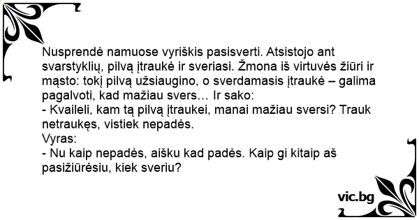 Įeina žmona į kambarį, žiūri – vyras ant svarstyklių stovi ir bando pilvą įtraukti. - Nemanau, kad tau tai padės… - Aišku, padės, o kaip kitaip skaičius pamatysiu?