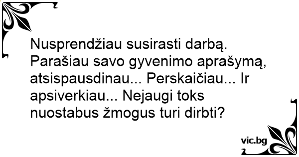 Nusprendžiau susirasti darbą. Parašiau savo gyvenimo aprašymą, atsispausdinau... Perskaičiau... Ir apsiverkiau... Nejaugi toks nuostabus žmogus turi dirbti?