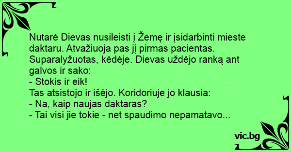 Nutarė Dievas nusileisti į Žemę ir įsidarbinti mieste daktaru. Atvažiuoja pas jį pirmas pacientas. Suparalyžuotas, kėdėje. Dievas uždėjo ranką ant galvos ir sako: