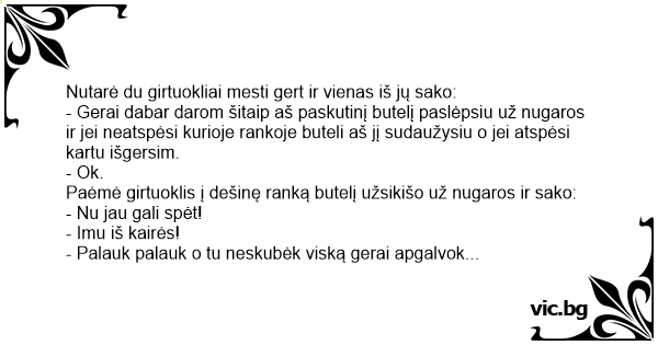 Paėmė girtuoklis į dešinę ranką butelį užsikišo už nugaros ir sako: