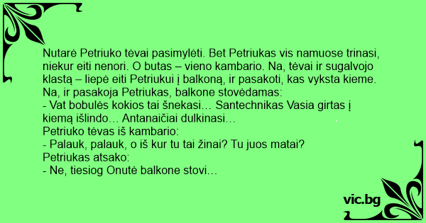 - Vat bobulės kokios tai šnekasi… Santechnikas Vasia girtas į kiemą išlindo… Antanaičiai dulkinasi…