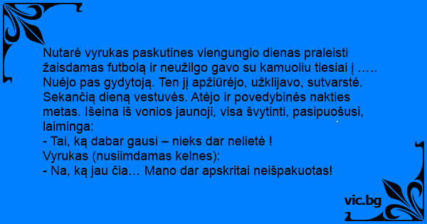 Nutarė vyrukas paskutines viengungio dienas praleisti žaisdamas futbolą ir neužilgo gavo su kamuoliu tiesiai į ….. Nuėjo pas gydytoją. Ten jį apžiūrėjo, užklijavo, sutvarstė. Sekančią dieną vestuvės. Atėjo ir povedybinės nakties metas. Išeina iš vonios jaunoji, visa švytinti, pasipuošusi, laiminga: