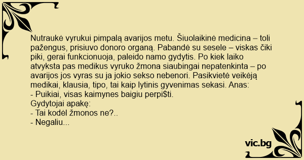 Nutraukė vyrukui pimpalą avarijos metu. Šiuolaikinė medicina – toli pažengus, prisiuvo donoro organą. Pabandė su sesele – viskas čiki piki, gerai funkcionuoja, paleido namo gydytis. Po kiek laiko atvyksta pas medikus vyruko žmona siaubingai nepatenkinta – po avarijos jos vyras su ja jokio sekso nebenori. Pasikvietė veikėją medikai, klausia, tipo, tai kaip lytinis gyvenimas sekasi. Anas: