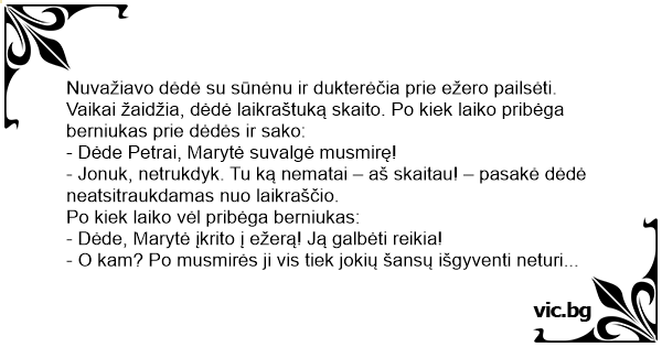 Nuvažiavo dėdė su sūnėnu ir dukterėčia prie ežero pailsėti. Vaikai žaidžia, dėdė laikraštuką skaito. Po kiek laiko pribėga berniukas prie dėdės ir sako: